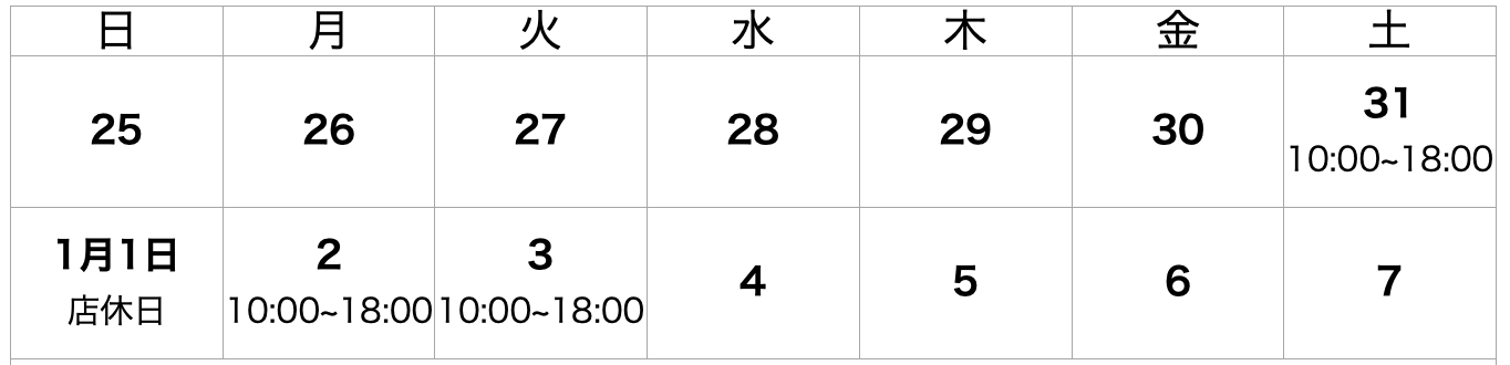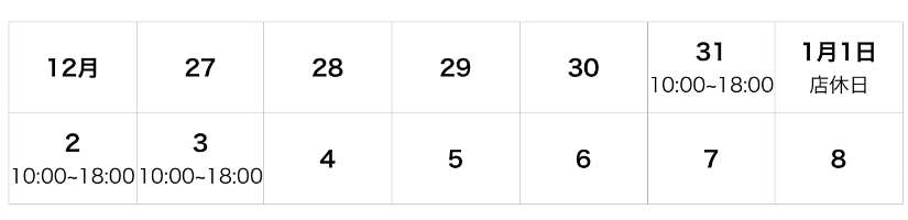 年内は12月30日まで、年始は1月4日から通常営業(10:00〜19:00)となります。