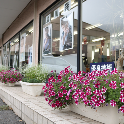 店舗前のペチュニア、ユーホルビアが見頃を迎えております。鮮やかな季節の花々は、店頭を華やかにしてくれますね。